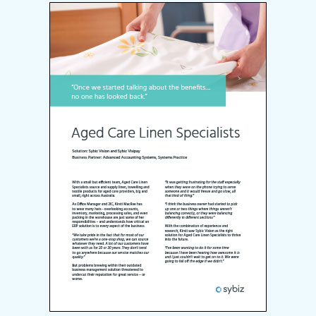 The close cooperation between Sybiz Authorised Business Partners also made the transition smoother for Kirsti and the team at Aged Care Linen Specialists.