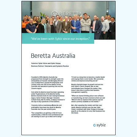 Sybiz Vision is helping Beretta to achieve their goals: increasing efficiency and profitability. By embracing Sybiz Vision’s capability to enhance workflows, provide highly customised insights, and a view towards utilising the great functionality introduced in our latest release, Beretta is dedicated to staying ahead of the competition.
