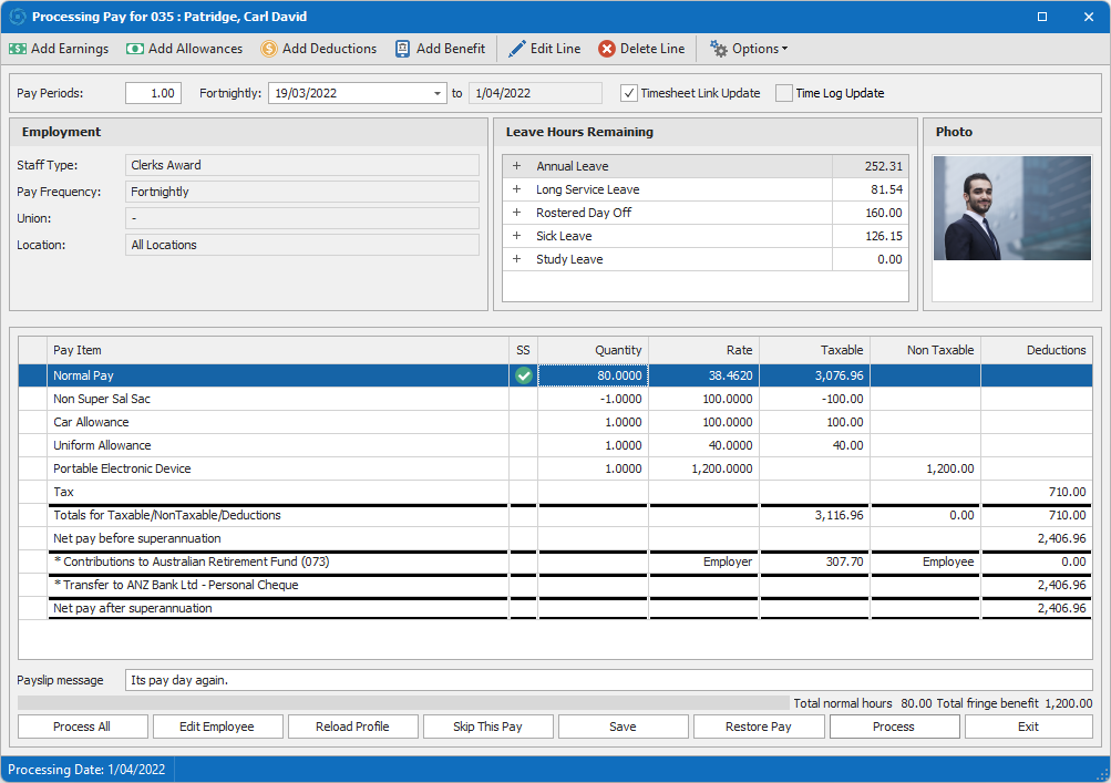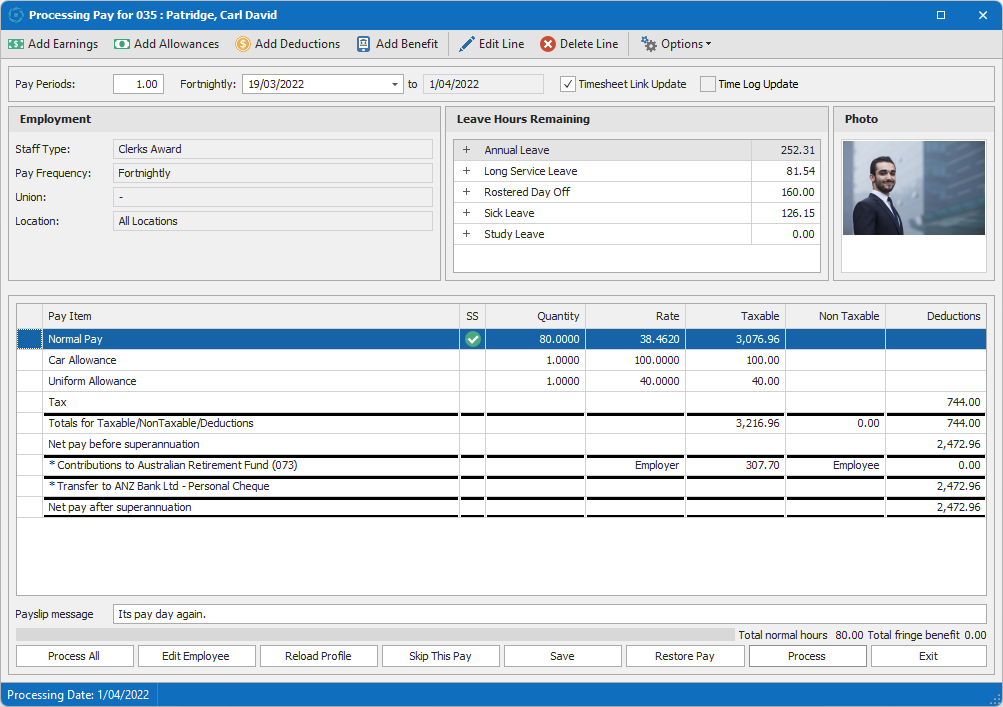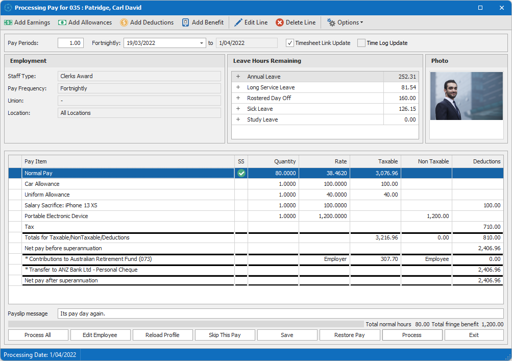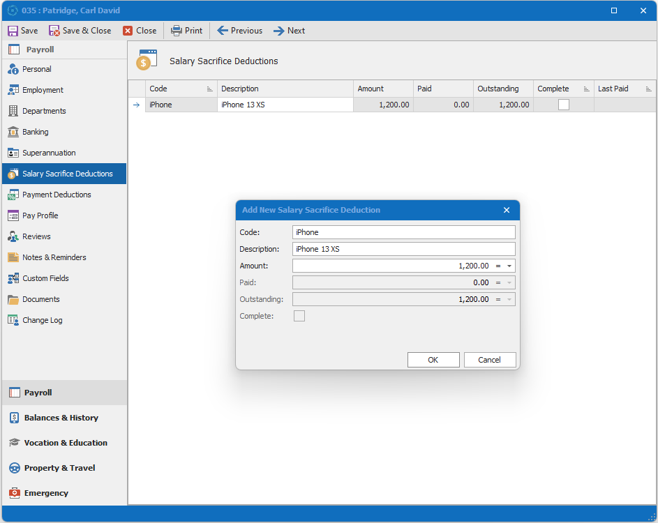 Additionally, we configure a salary sacrifice item in the Employee’s record which allows us to keep track of the sacrifice amount vs the benefit attained. This is especially useful if the employee has arranged to periodically sacrifice, rather than sacrificing a single lump sum.