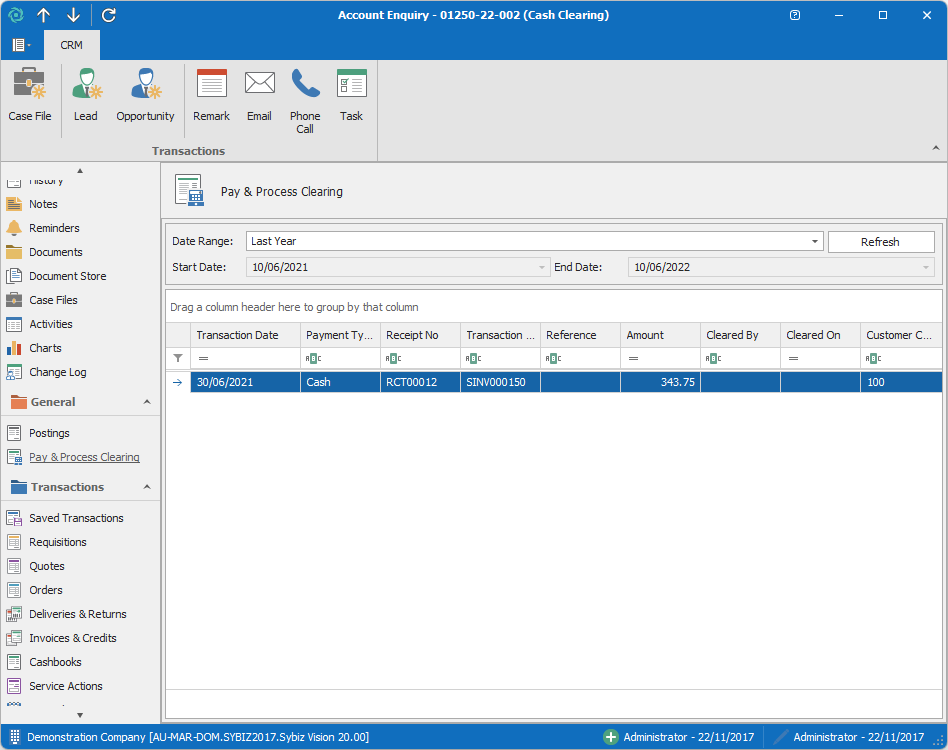 Users are now able to view the status information of clearing accounts that have been used for Pay & Process directly from the General Ledger enquiry screen. This new option gives users the ability to drill down on the transaction and view whether it has been cleared, when and by which user. (CR210846784)