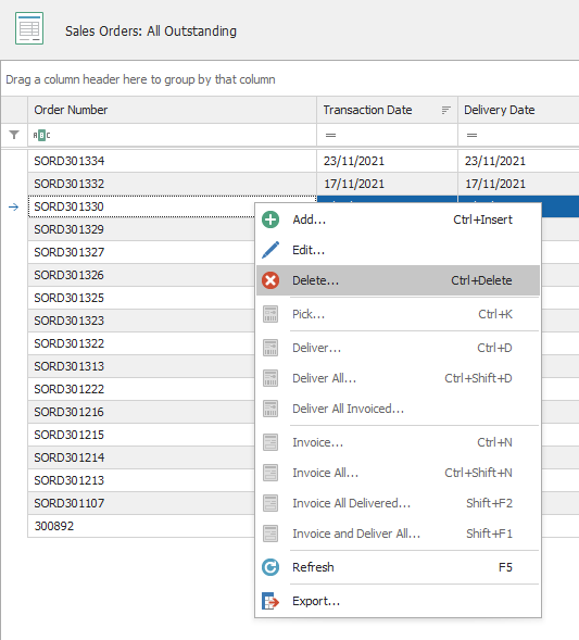 Users can now cancel or delete sales and purchase orders directly from the relevant order screen without having to run the cleanse order wizard, with a new right-click option for easy access. This will enable users to quickly delete orders one at a time when required. (CR210946918)