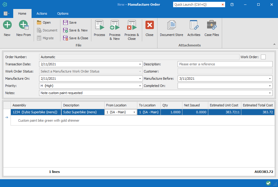 Users are now able to add line notes, such as basic recipe instructions, to first-level assemblies on manufacture orders. This new addition allows users to include specific information about particular assemblies on a per component level. Notes added then become part of the recipe definition for that order, extending more flexibility for custom manufacturing. Notes are optional and can be configured in settings. Once activated, notes are saved to the user state and can be seen in reports. (CR170333343)