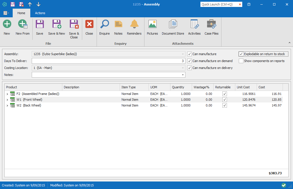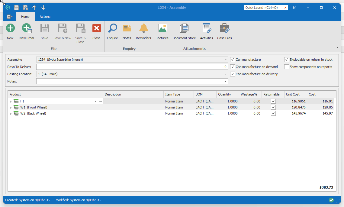 Improvements have been made to assembly functionality to provide greater flexibility and to better represent individual items grouped together at the time of sale. From Sybiz Vision 22.00, when an assembly is returned via a sales return, if it is checked for ‘manufacture on delivery’ but not ‘explodable on return to stock’ it will be returned as a finished good, regardless of the settings on the sub-components.