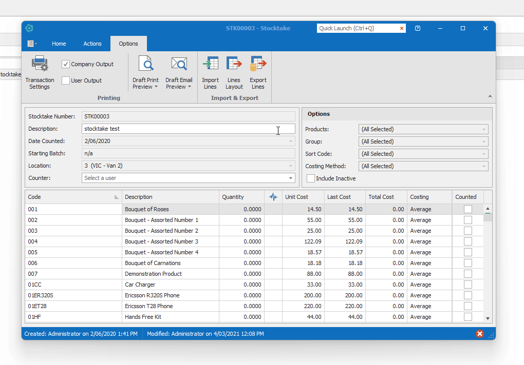 A new export option is now available which enables users to export all lines from a stocktake into a Microsoft Excel spreadsheet. This spreadsheet can be edited and then reimported back into Sybiz Vision. In addition, a location selection is now required when creating a stocktake in databases with multiple locations to reduce user error with the previous default location behaviour. (CR2106646357, CR210446111)