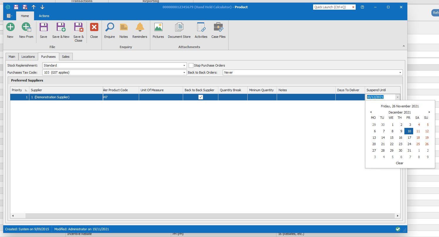 A 'suspend until date' has now been added for preferred suppliers, allowing users to temporarily suspend purchase orders for preferred suppliers of certain products. If this option is used, the supplier will not be suggested by default before the suspend date but can still be used for manual ordering, with a warning keeping users informed. (CR210946919)