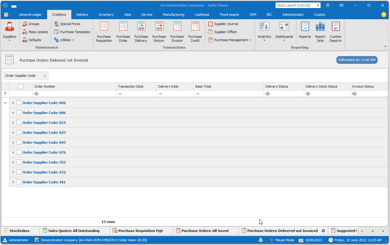 The multi-select functionality you already love in Sales Management is now available in Purchase Management. Users can now group and multi-select transactions and easily convert purchase orders and deliveries into invoices, for example. Users can right-mouse click on the group header to consolidate, or you can select multiples by right-mouse clicking outside of the group. (CR210646313)