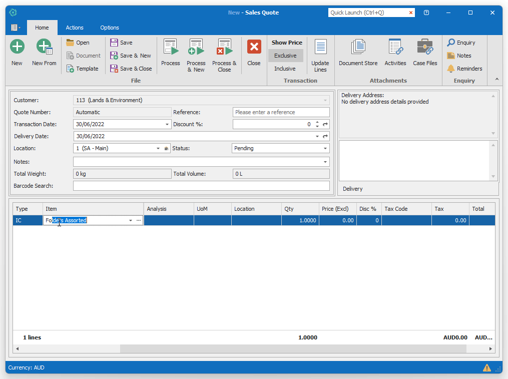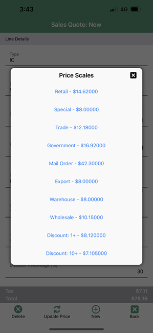 All possible price calculations are now displayed on price dropdowns in open transactions, including customer special prices, discounts, and quantity related price specials (for example, customers receive a reduced rate if they purchase 10 or more of an item). This exciting change will allow sales reps and administration staff greater pricing clarity on the fly and provides a better sales experience for their customers. Selecting a new price from the dropdown does not affect the quantity of the transaction.