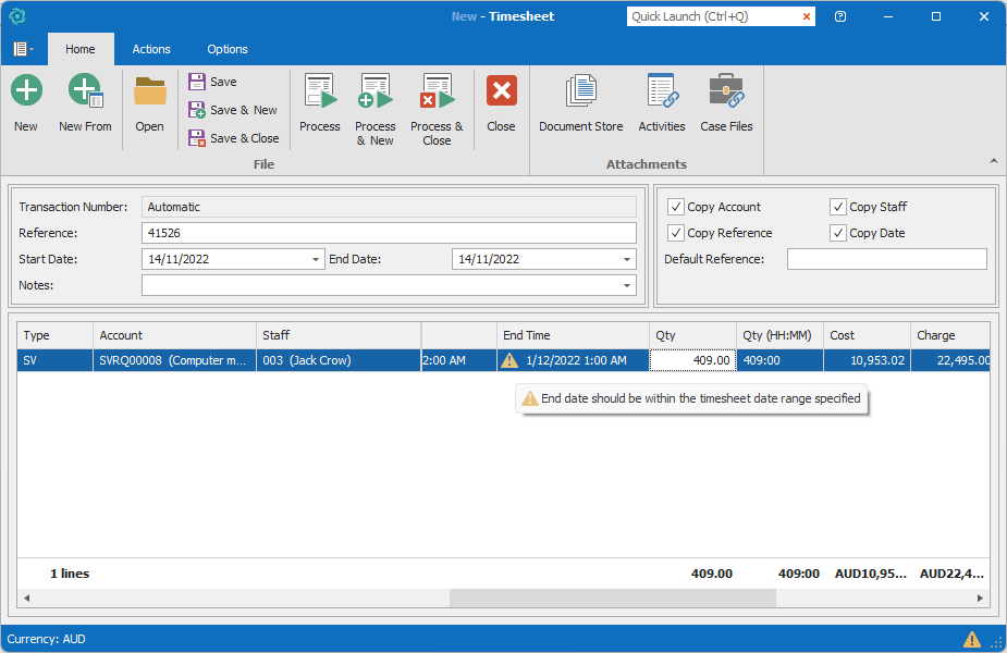 Job and Service timesheets in Sybiz Vision previously generated errors in instances where the time input exceeds the end date of the timesheet to prevent user error. This function has now changed to a warning, allowing users to process the timesheet where times do not exactly match but still warning them in case of error. (CR190540824)