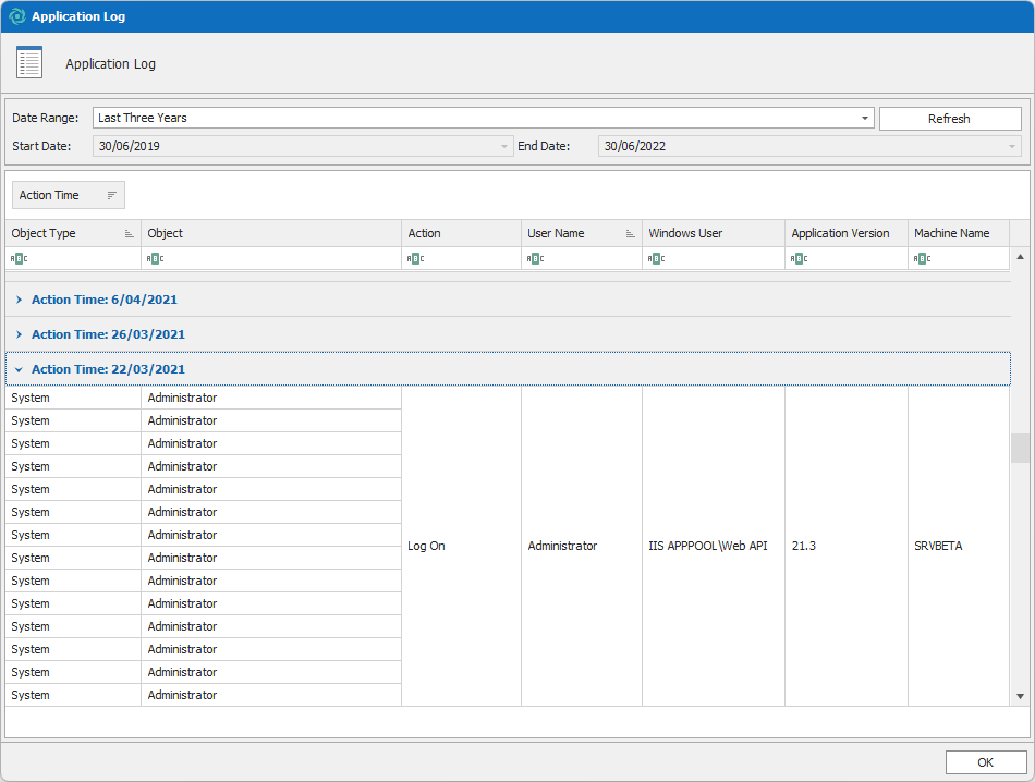 The Application Log now operates in a separate screen, allowing it to function and search while the user is utilising other parts of Sybiz Vision. The process is now driven by date range rather than restricted by the individual entries, and can be filtered by column, allowing for a more simple and efficient search process.