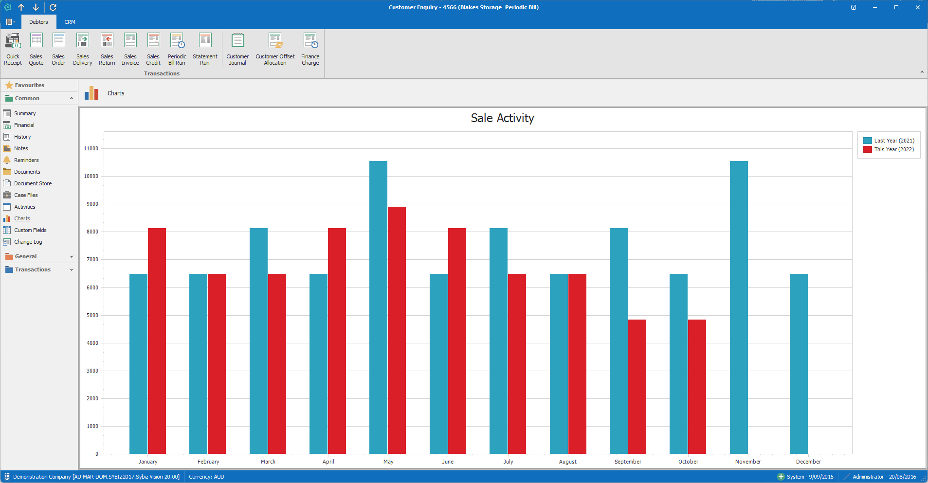 Charts in the debtor, creditor, and inventory ledgers are now based on a rolling 12 months from the current system date (still ordered by January - December). This upgrade to a rolling 12-month system allows users to more easily view data with a month-by-month comparison, year-on-year. Users can change their system session date as a once off as needed by clicking on the calendar date on the bottom right of the main Sybiz Vision screen and setting a specific date. (CR170433473)