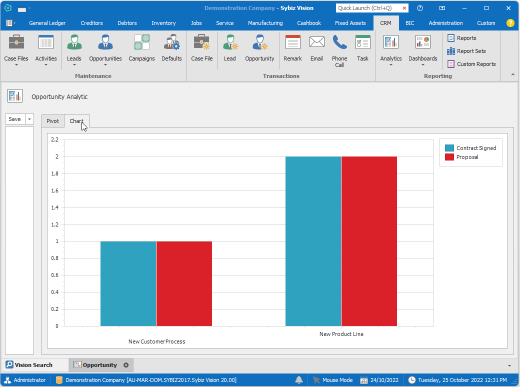 Pivots in Analytics have become tab based, with pivots and charts now viewable independently of each other. This will be particularly useful for large pivots with a lot of data, or where users prefer to only look at numbers or a visual representation of trends. Where no cells are selected, all data will be displayed on the Chart tab, however users may select rows or columns of cells on the Pivot tab and have only that data displayed on the Chart tab. (CR170433473)