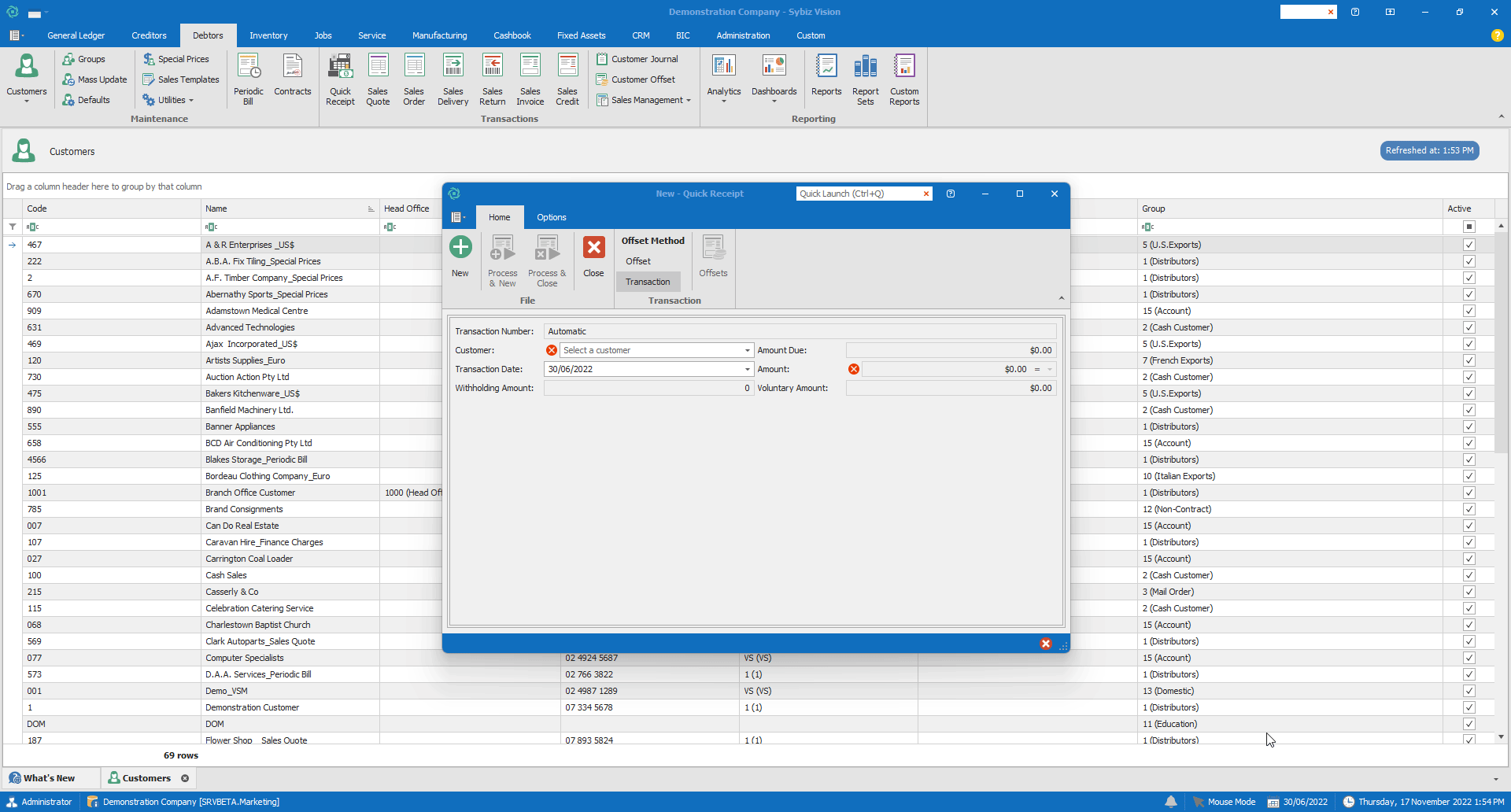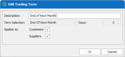 A new trading term has been included in Sybiz Vision 23. Called 'End of Next Month' in look ups, this is now automatically available to allow for more flexibility in payment and trading terms for customers and suppliers. For customers who do not wish to use this trading term, it can be easily unselected in the Lookups menu. (CR210445855)
