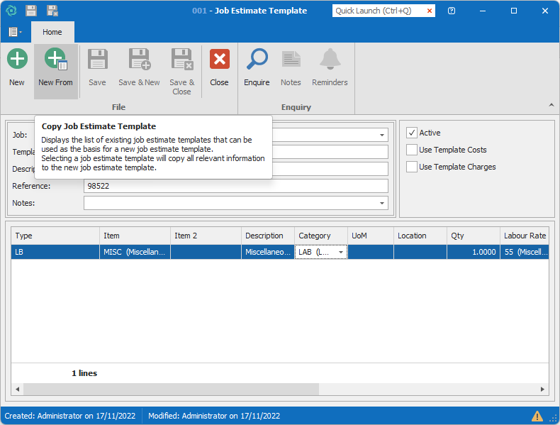 New Job Estimate Templates can now be created from existing Job Estimate Templates using the New From option, making Job Estimate Template creation even faster. (CR2207-0887)