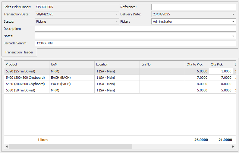 A barcode scanner can be repeatedly used on sales pick transaction lines to increase the quantity picked by 1. Users can also find products by code if no matching barcode is found, and if no valid product is found in a sales pick, a beep sound is played. (CR2503-4513)
