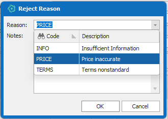 Purchase requisition reject reasons can now be defined. Their use is not mandatory, and there are no changes to behaviour on upgrade. Once activated, a reject reason is required to reject any requisition. Notes are still optional (CR2406-3771)