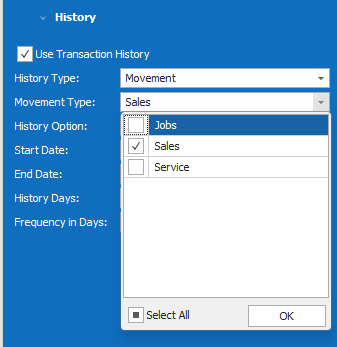 Suggested Purchase Orders have been extended to cover Job and Service movement through a new "Movement Type" option. The default is to include Sales transactions, but now users can chose to include job costs, and service actions and associated transfers. (CR2412-4253)