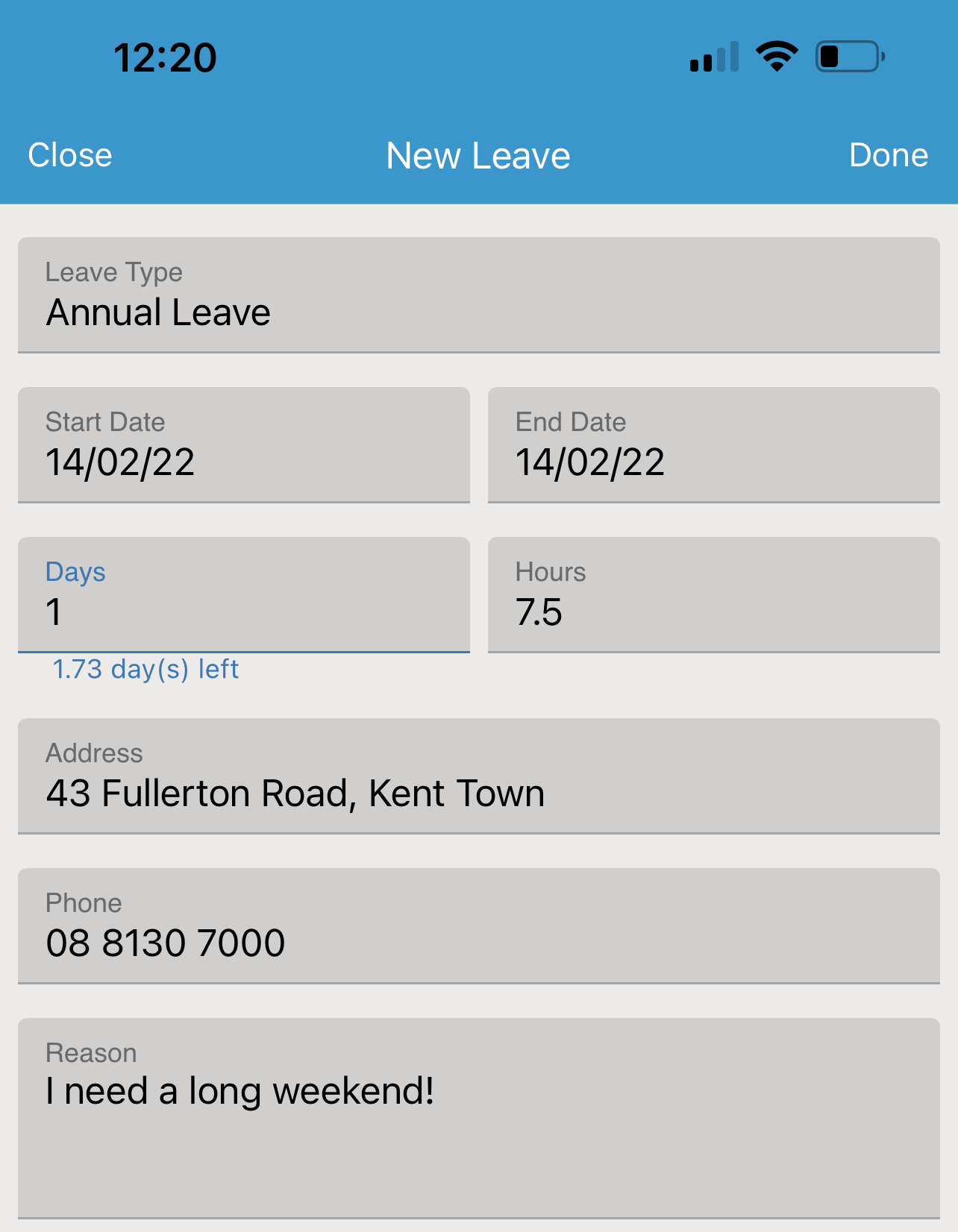 Day(s) left for the leave type requested now display on new leave requests, making it easier for applicants to see how much leave they are able to request without going into negative.