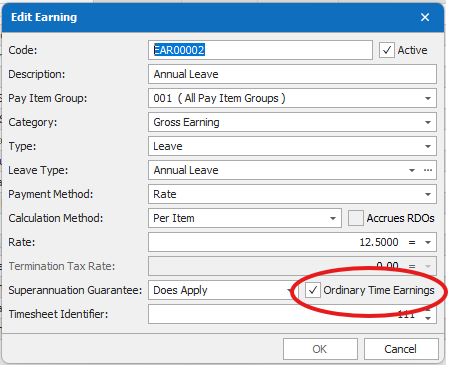 An Ordinary Time Earnings (OTE) option has been added to earnings and allowances. Upon upgrade, pay items that are set to Superannuation Guarantee: Does Apply will be flagged as Ordinary Time Earnings. It is important to review all pay items to ensure this is the desired setting. An earning item that doesn't apply super cannot be configured as OTE. This new check box is in advance of the prospective implementation of Payday Super; changes to the data reported in STP2 will occur beyond the 2025/26 financial year. (CR2410-4115)